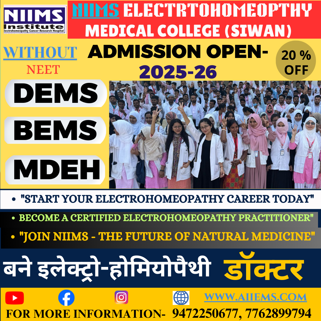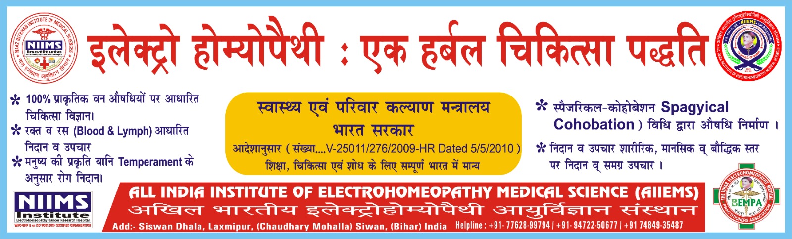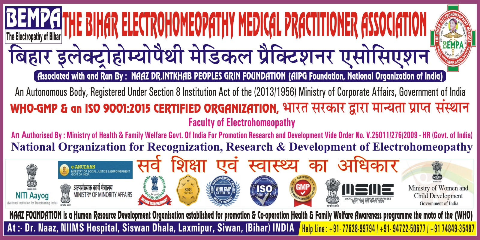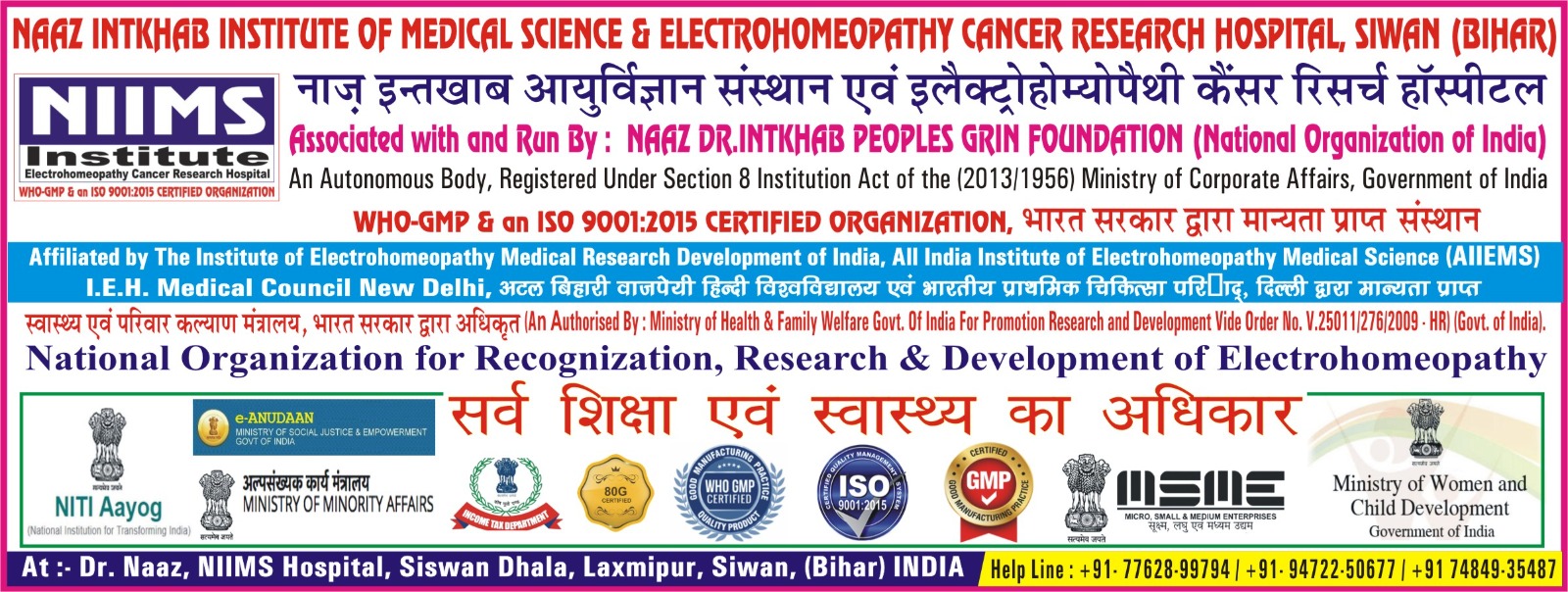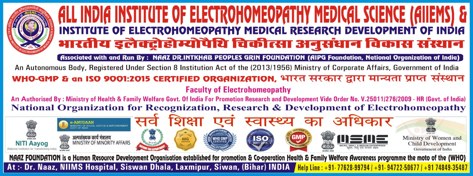 All India Institute of Electrohomeopathy Medical Sciences (AIIEMS) / Institute of Electrohomeopathy Medical Research Development of India ,C Office : At. B- 133,pOCKET 11 Jasola, New Delhi- 110025 . Associated with and run by (The AIPG FOUNDATION) / NAAZ DR INTKHAB PEOPLE GRIN FOUNDATION (NDIPGF). Registered by the Government of India, Ministry of Corporate Affairs Section 8 institution act of (1) Companies Act.2013. National organizations of India.